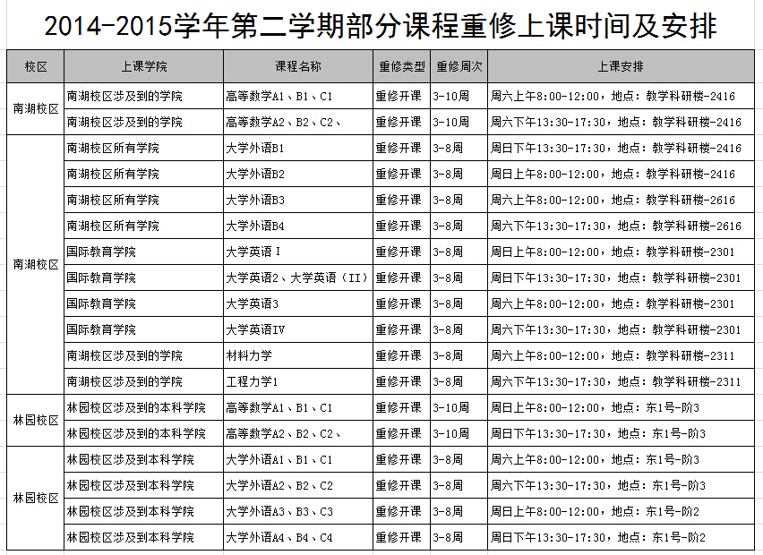 1、以员工自愿的形式组织重修课程的学习及考核,北湖校区2014级同学在本学期不开设重修课程。