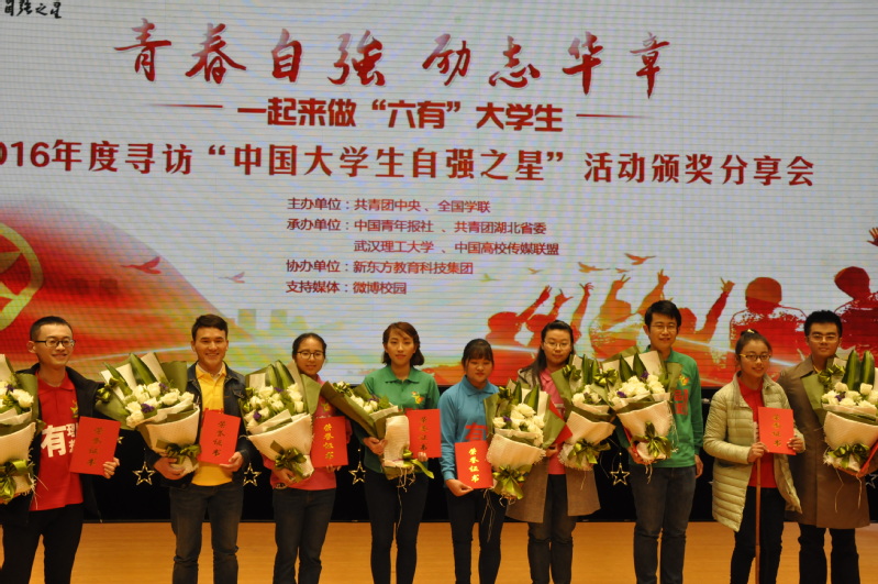本网讯(通讯员周巍)3月31日,由共青团中央、全国学联主办的2016年度寻访“中国老员工自强之星”活动颁奖分享会在武汉理工大学举行。团中央书记处书记傅振邦、湖北省政府副秘书长聂昌斌、新东方教育科技集团董事长俞敏洪、中国青年报社副总编辑董时等出席了颁奖分享会。