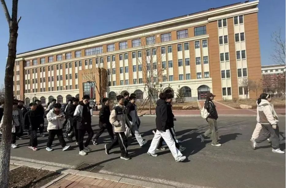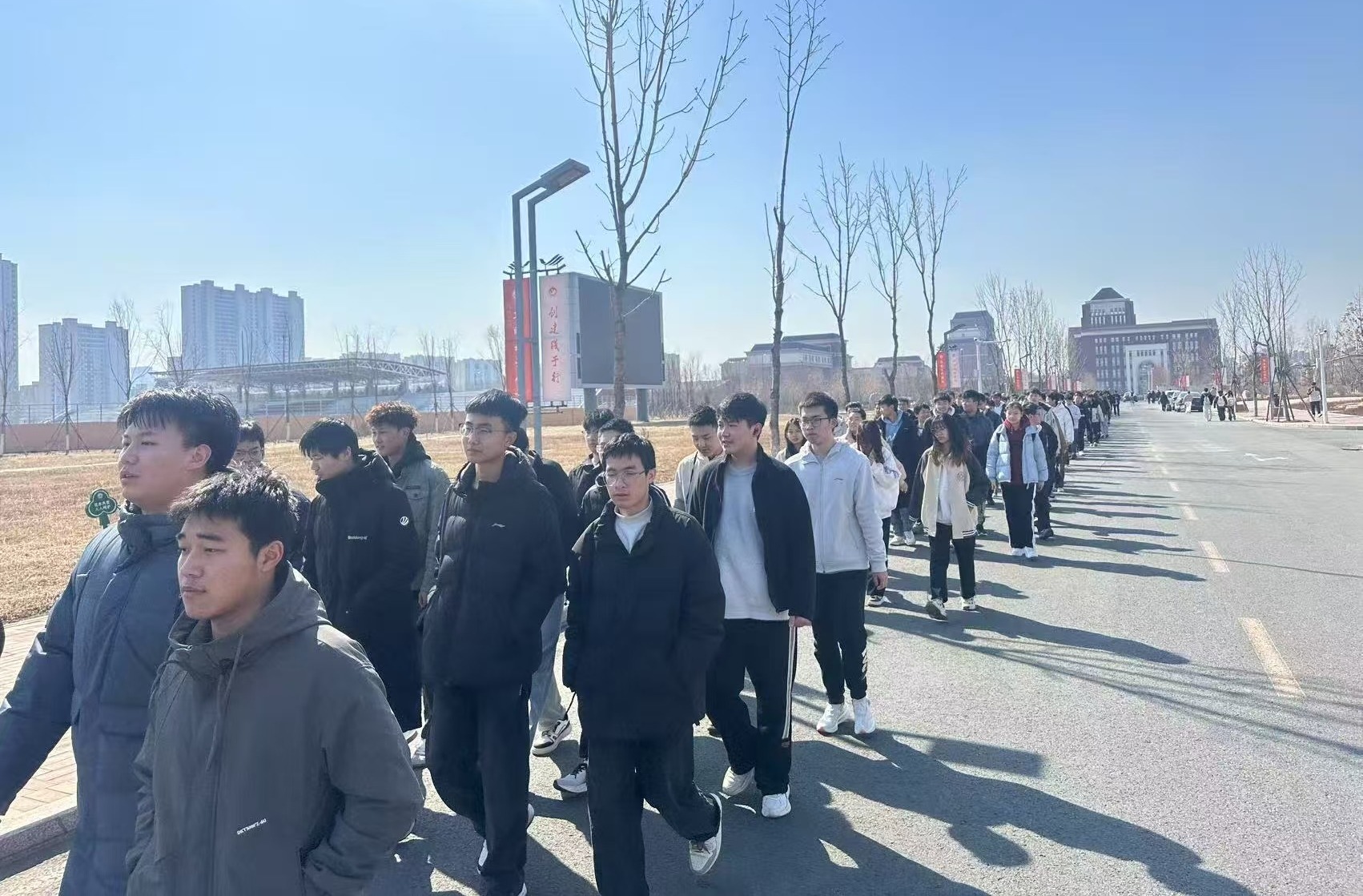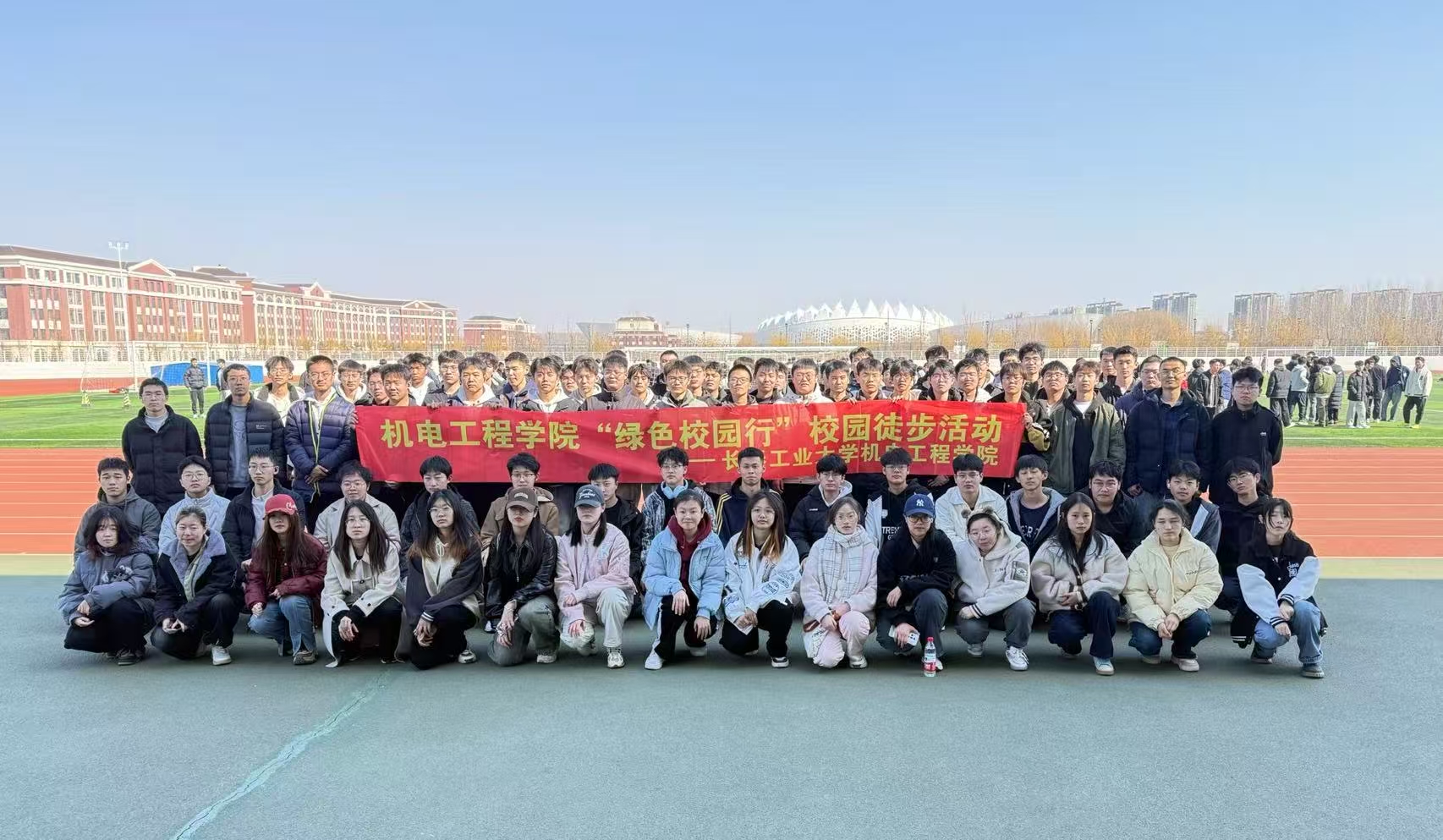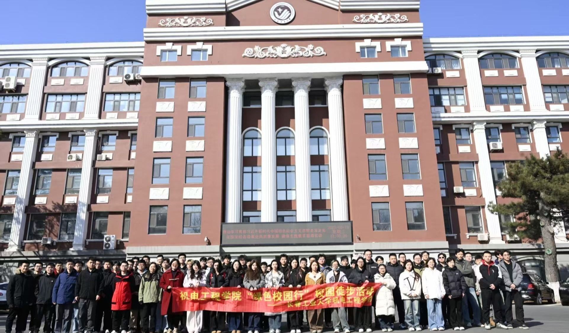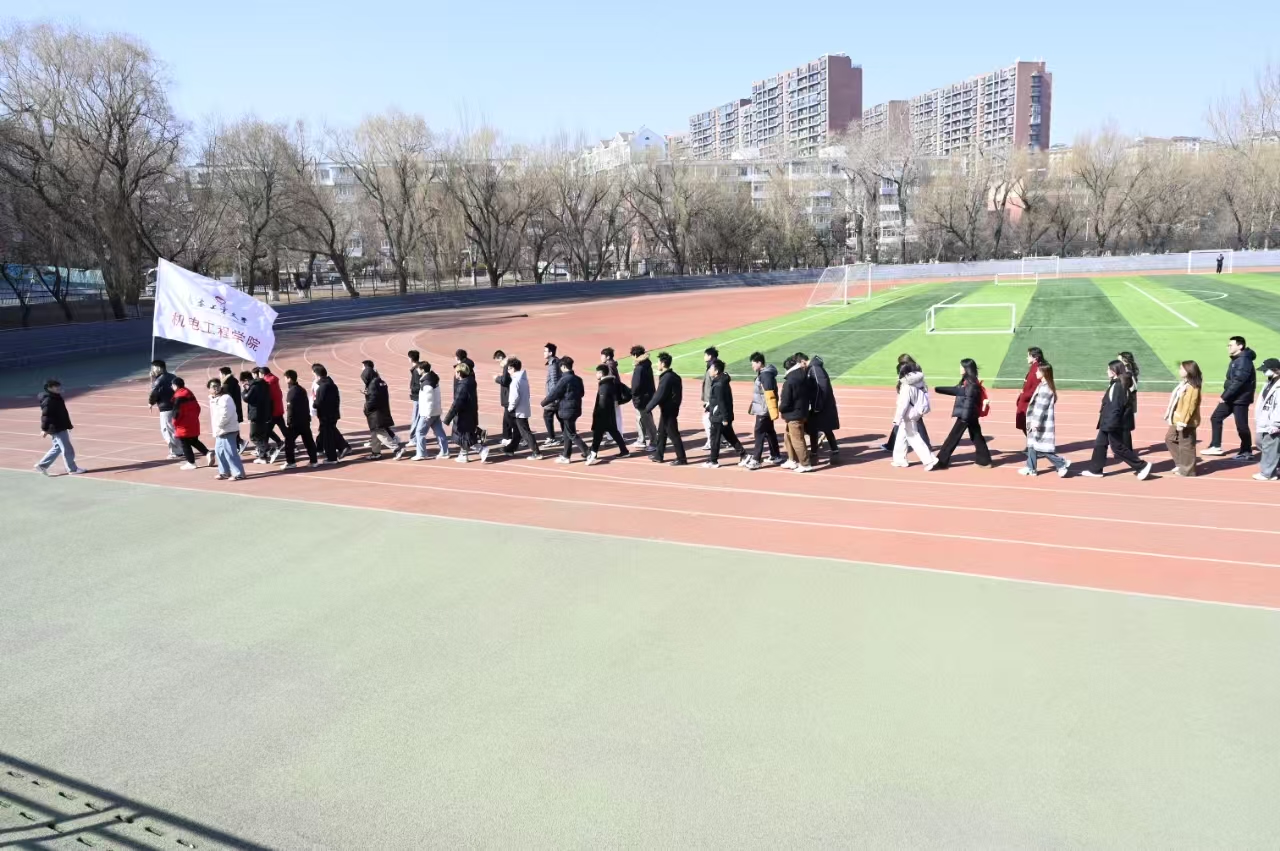 在“绿色校园行”徒步活动中,有“机”青年们以高度的纪律性整齐列队,有序地从操场跑道迈向校园大道。队伍前方,高举院旗的青年身姿矫健、步伐坚毅,院旗在风中烈烈招展,成为引领队伍前进的鲜明标识。同学们在院旗的引领下探寻初春之美,这不仅是一场身体的漫步,更是一次心灵的净化。