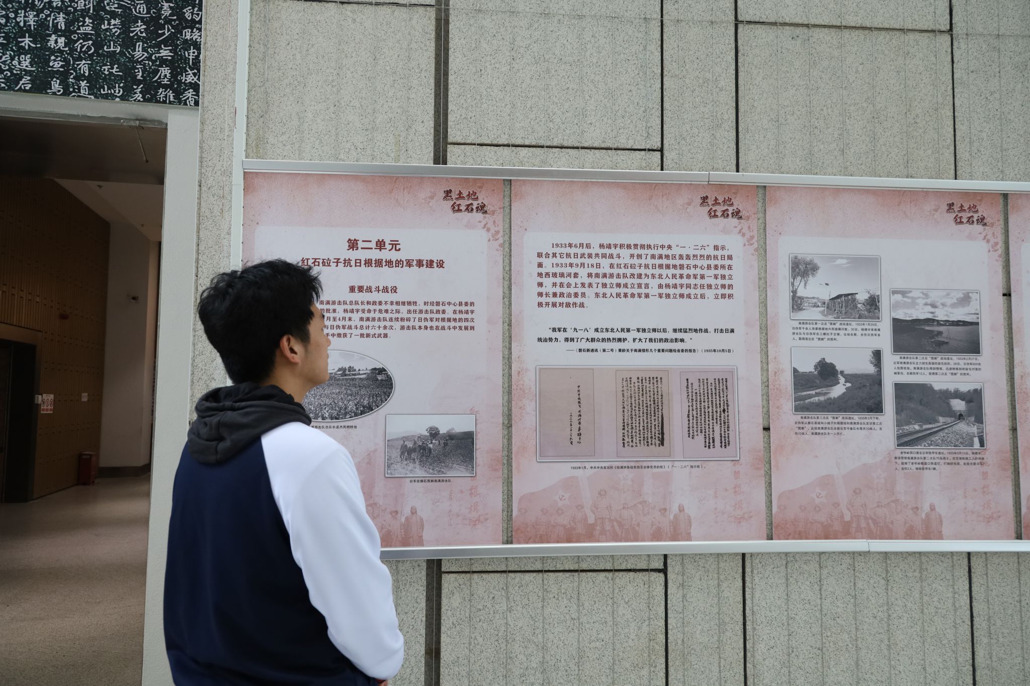 “黑土地、红石魂”主题展通过丰富的图片、出土文物,生动展现了东北抗联的发展历史,带领同学们重回90余年前那段悲壮而光辉的抗日岁月。展馆共分为四个部分:“东北沦陷”,展现了山河破碎时的艰难时局;“曙光出现”,讲述了希望在黑暗中孕育的过程;“根据地创建历程”,详细介绍了红石砬子抗日根据地从无到有的艰辛奋斗;“英名永存”,缅怀了为抗战胜利付出生命的英雄先烈。